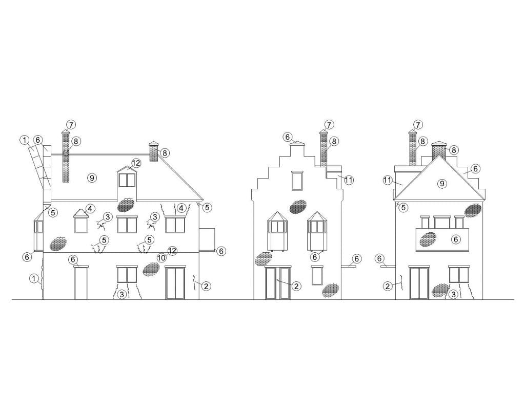 8. misvormde/ verdraaide/ beschadigde schoorstenen.